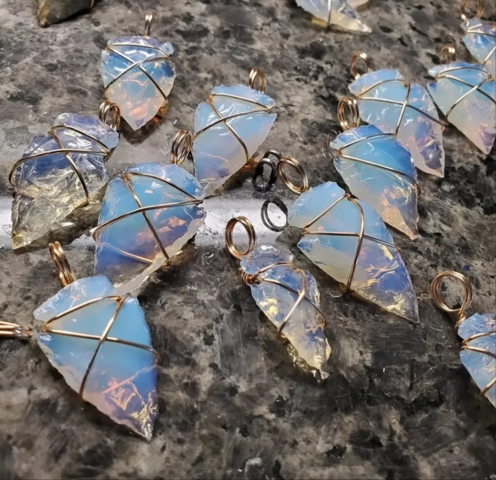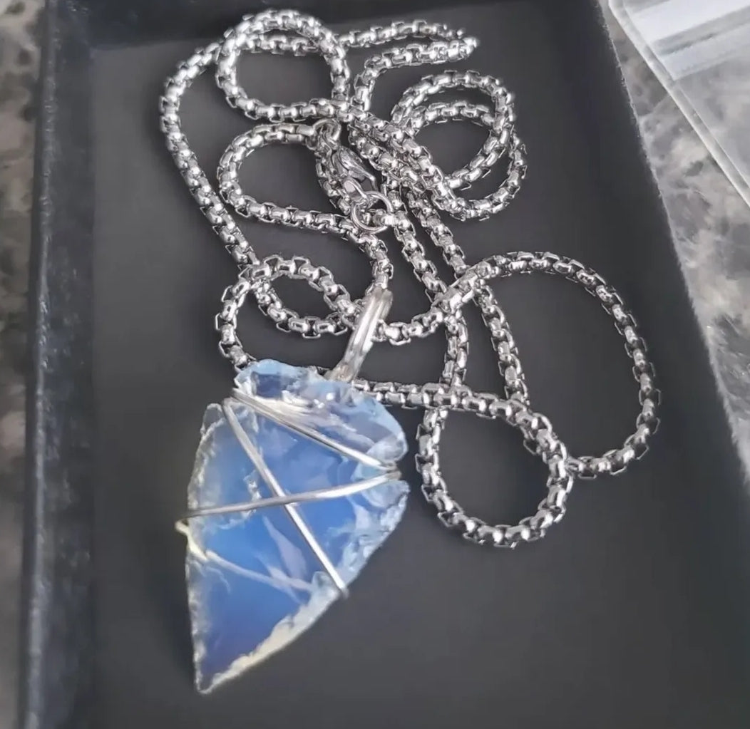 'Inner Light', our best selling opalite arrowhead necklace. Handcrafted and mounted on your choice of gold or silver copper wire. Set on a dazzling 22-inch stainless steel chain.